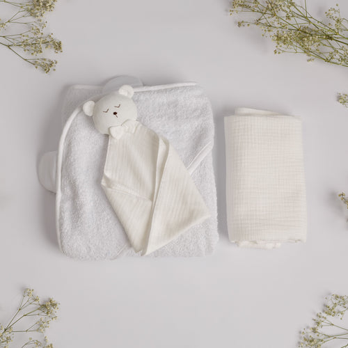 Set Cadou pentru Nou-nascut cu minipaturica Ursulet, prosop 100x100 cm, paturica muselina simpla10%