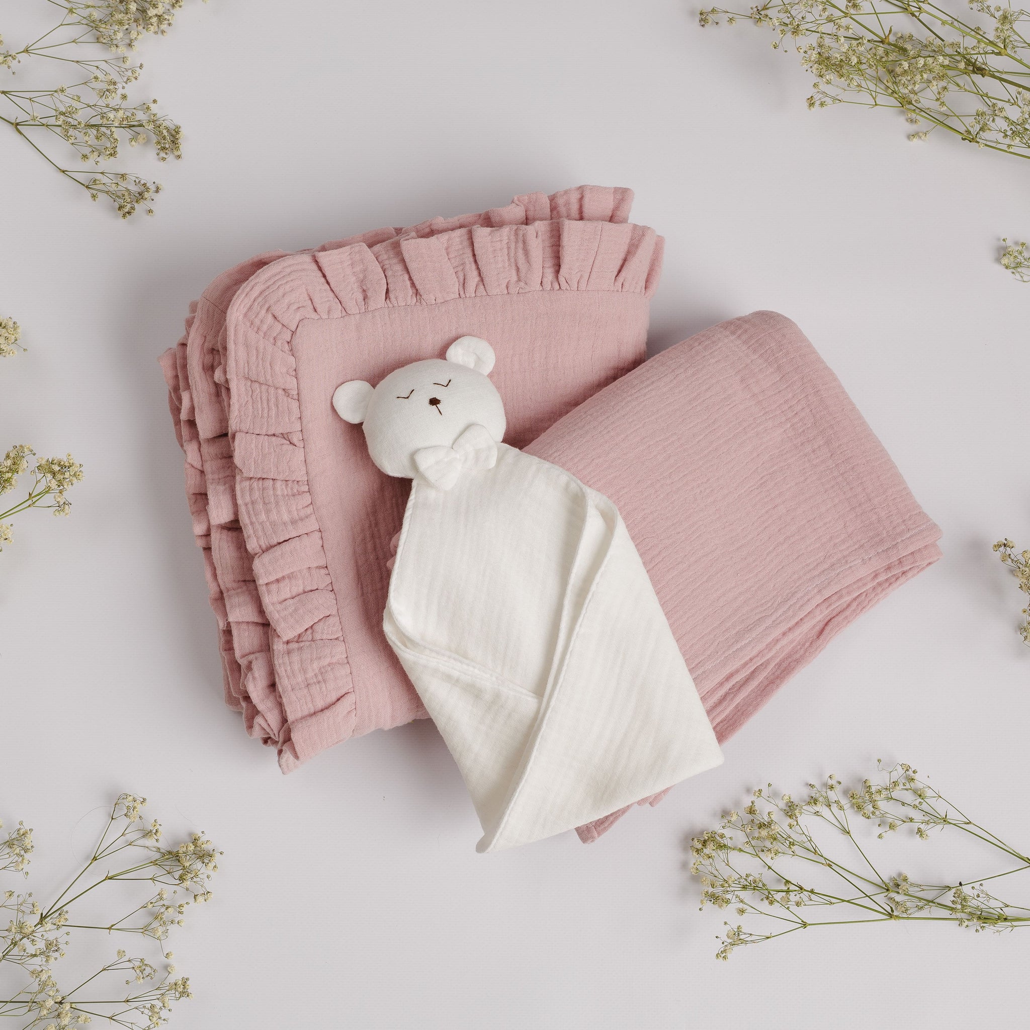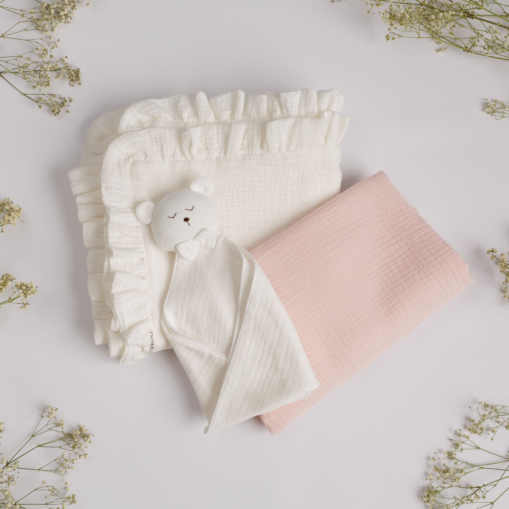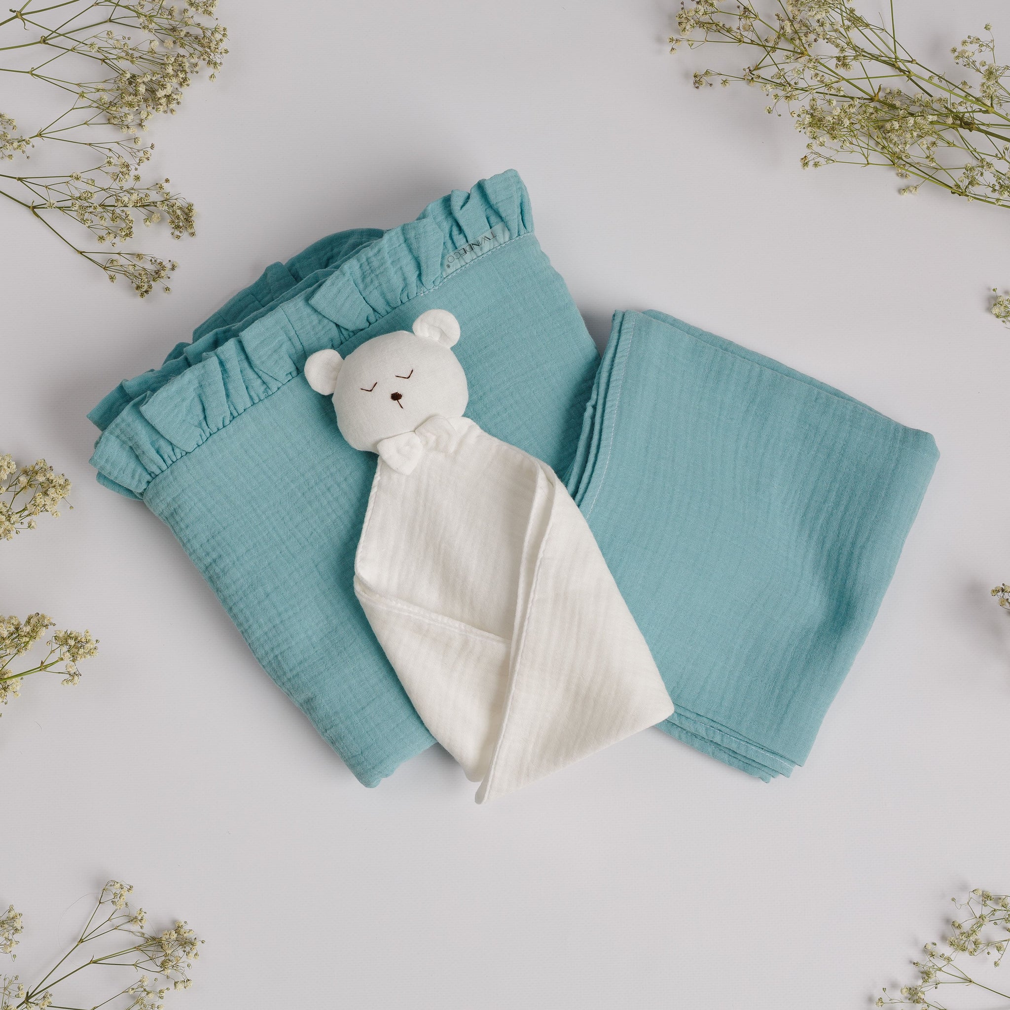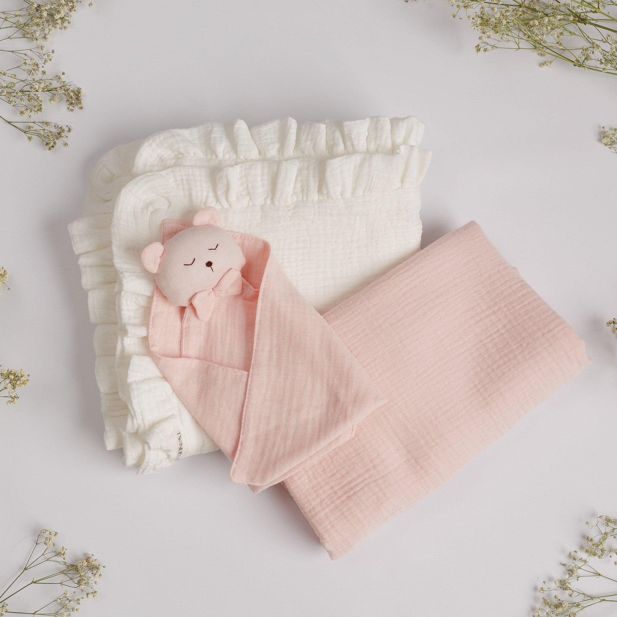 Set Cadou pentru Nou-nascut cu minipaturica Ursulet, 2 paturici muselina simpla si volanase