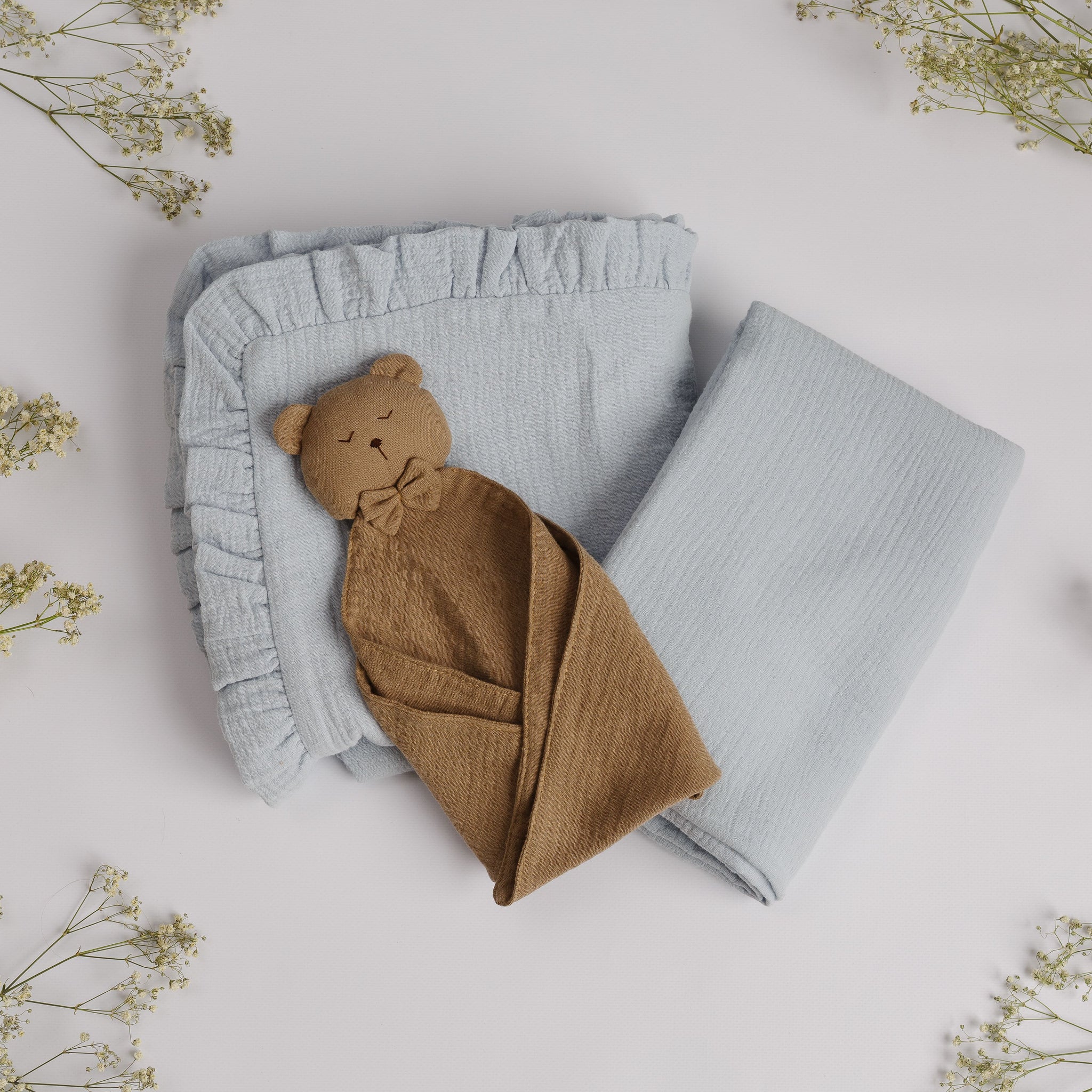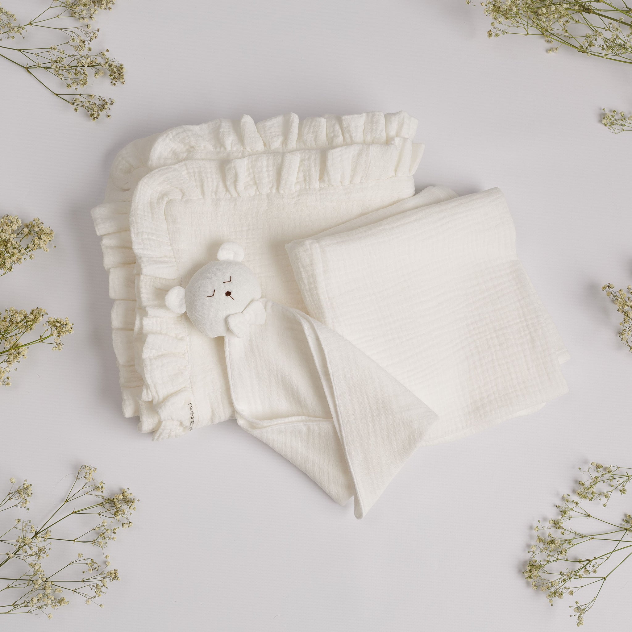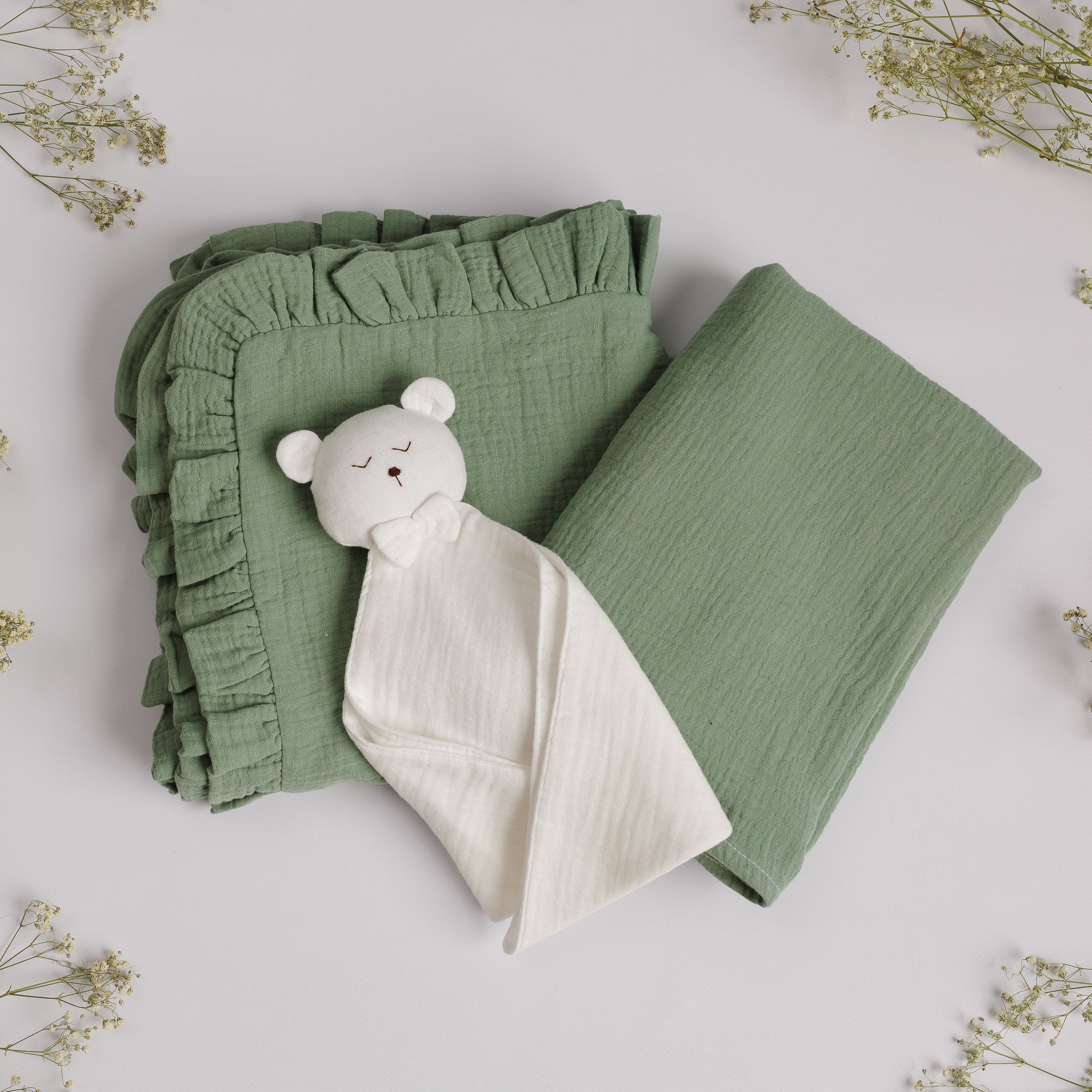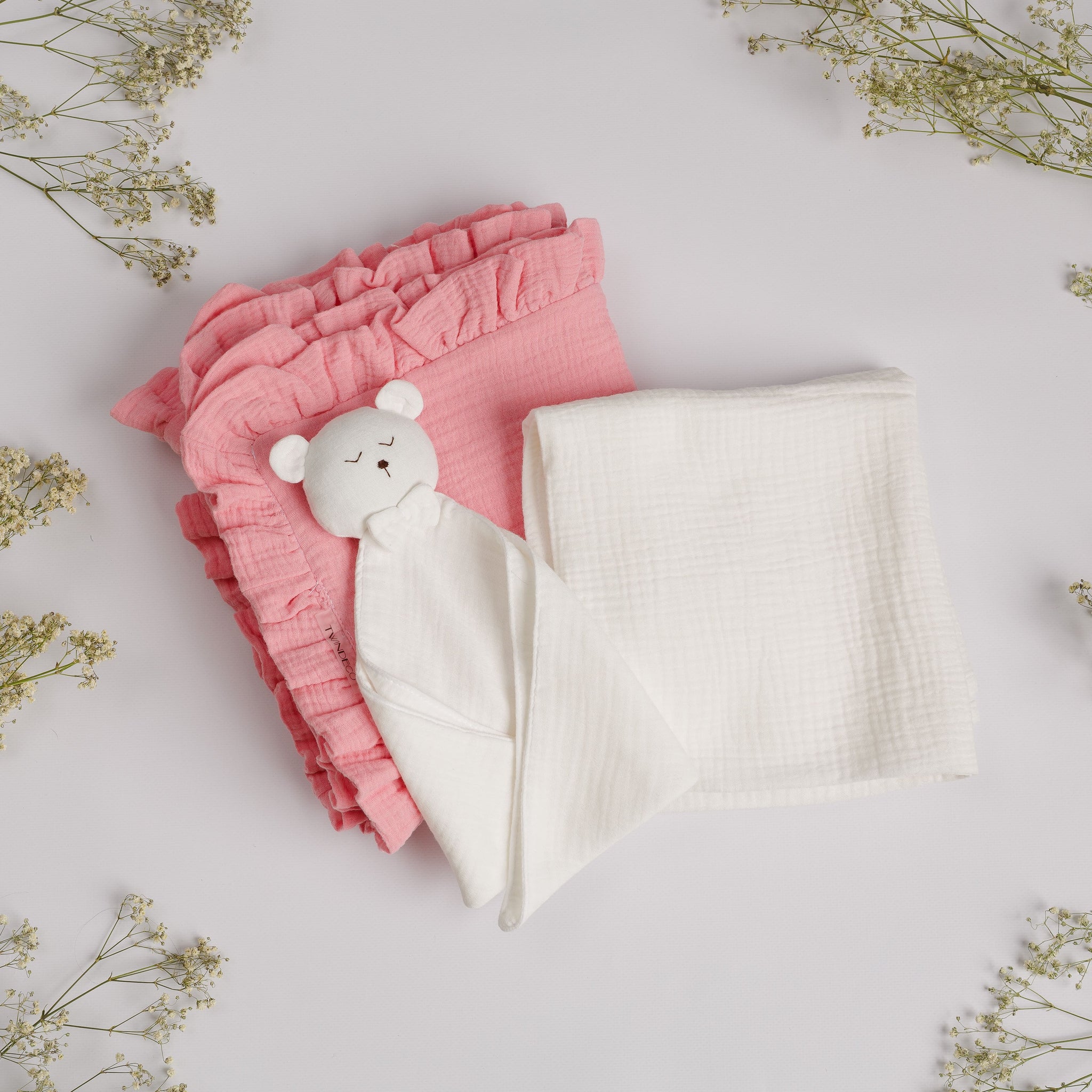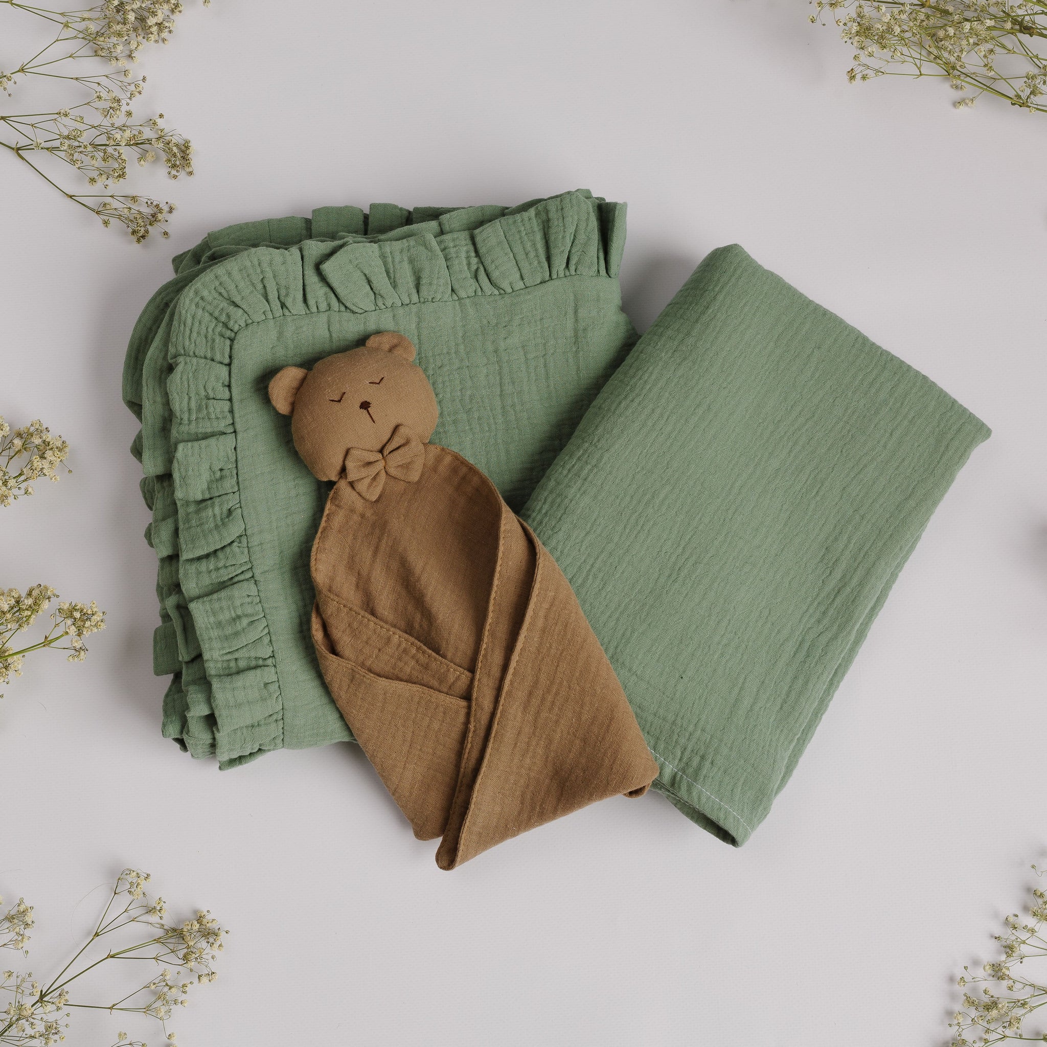 Set Cadou pentru Nou-nascut cu minipaturica Ursulet, 2 paturici muselina simpla si volanase